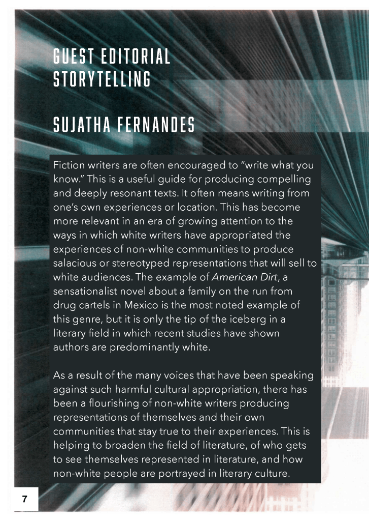 Fiction writers are often encouraged to “write what you know.” This is a useful guide for producing compelling and deeply resonant texts. It often means writing from one’s own experiences or location. This has become more relevant in an era of growing attention to the ways in which white writers have appropriated the experiences of non-white communities to produce salacious or stereotyped representations that will sell to white audiences. The example of American Dirt, a sensationalist novel about a family on the run from drug cartels in Mexico is the most noted example of this genre, but it is only the tip of the iceberg in a literary field in which recent studies have shown authors are predominantly white.