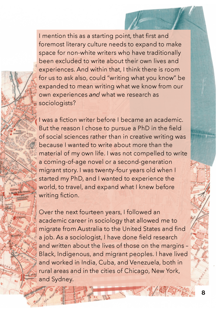 I mention this as a starting point, that first and foremost literary culture needs to expand to make space for non-white writers who have traditionally been excluded to write about their own lives and experiences. And within that, I think there is room for us to ask also, could “writing what you know” be expanded to mean writing what we know from our own experiences and what we research as sociologists?