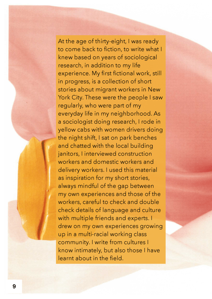 At the age of thirty-eight, I was ready to come back to fiction, to write what I knew based on years of sociological research, in addition to my life experience. My first fictional work, still in progress, is a collection of short stories about migrant workers in New York City. These were the people I saw regularly, who were part of my everyday life in my neighborhood. As a sociologist doing research, I rode in yellow cabs with women drivers doing the night shift, I sat on park benches and chatted with the local building janitors, I interviewed construction workers and domestic workers and delivery workers. I used this material as inspiration for my short stories, always mindful of the gap between my own experiences and those of the workers, careful to check and double check details of language and culture with multiple friends and experts. I drew on my own experiences growing up in a multi-racial working class community. I write from cultures I know intimately, but also those I have learnt about in the field.