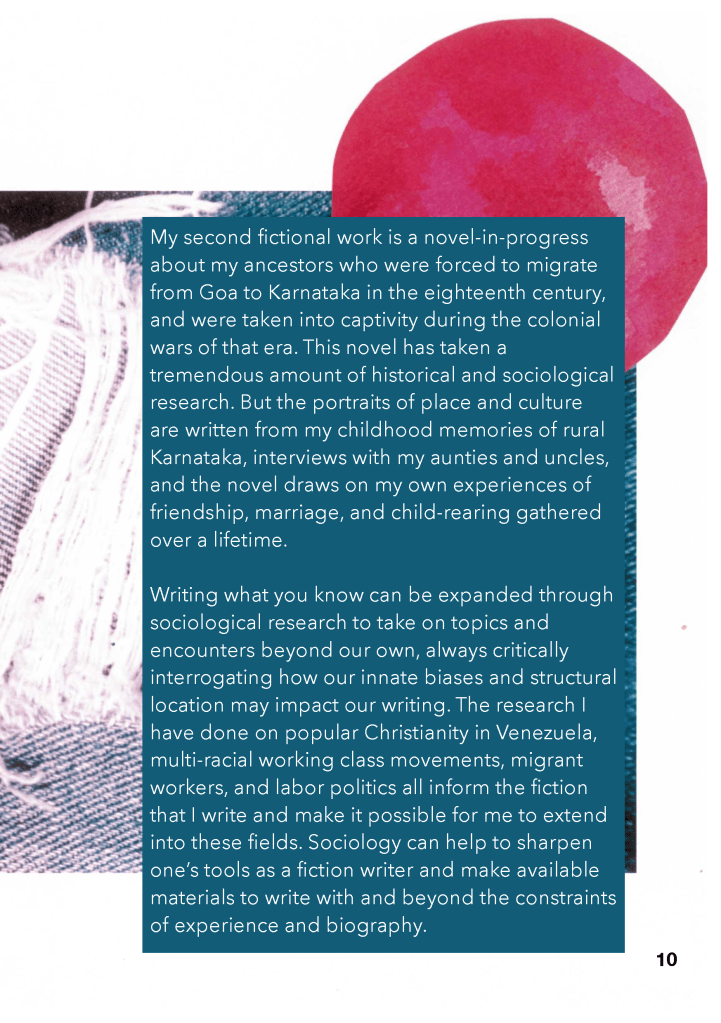 Writing what you know can be expanded through sociological research to take on topics and encounters beyond our own, always critically interrogating how our innate biases and structural location may impact our writing. The research I have done on popular Christianity in Venezuela, multi-racial working class movements, migrant workers, and labor politics all inform the fiction that I write and make it possible for me to extend into these fields. Sociology can help to sharpen one’s tools as a fiction writer and make available materials to write with and beyond the constraints of experience and biography.